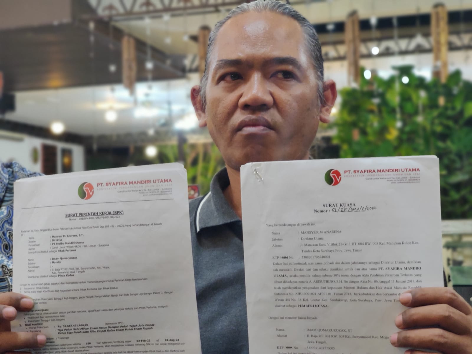 Ia menyebut bahwa ada ikatan kerja antara PT Shafira Mandira Utama yang sudah diputus kontrak bersama Pak Imam selaku koordinator lapangan sekaligus supplier dengan PT Brantas Abipraya Maju KSO di pekerjaan tanggul pengendali rob di Degayu dan Pantai Slamaran.