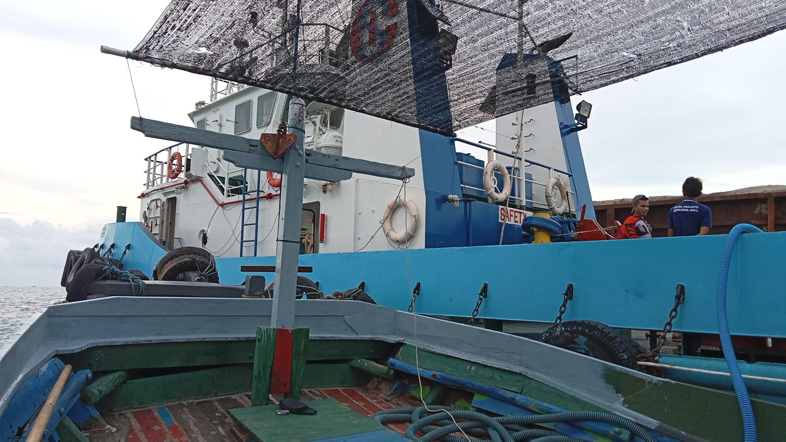 Perahu nelayan yang dimodifikasi jadi penampung mengirimkan muatan berisi air tawar ioegal ke kapal yang berada di tengah laut