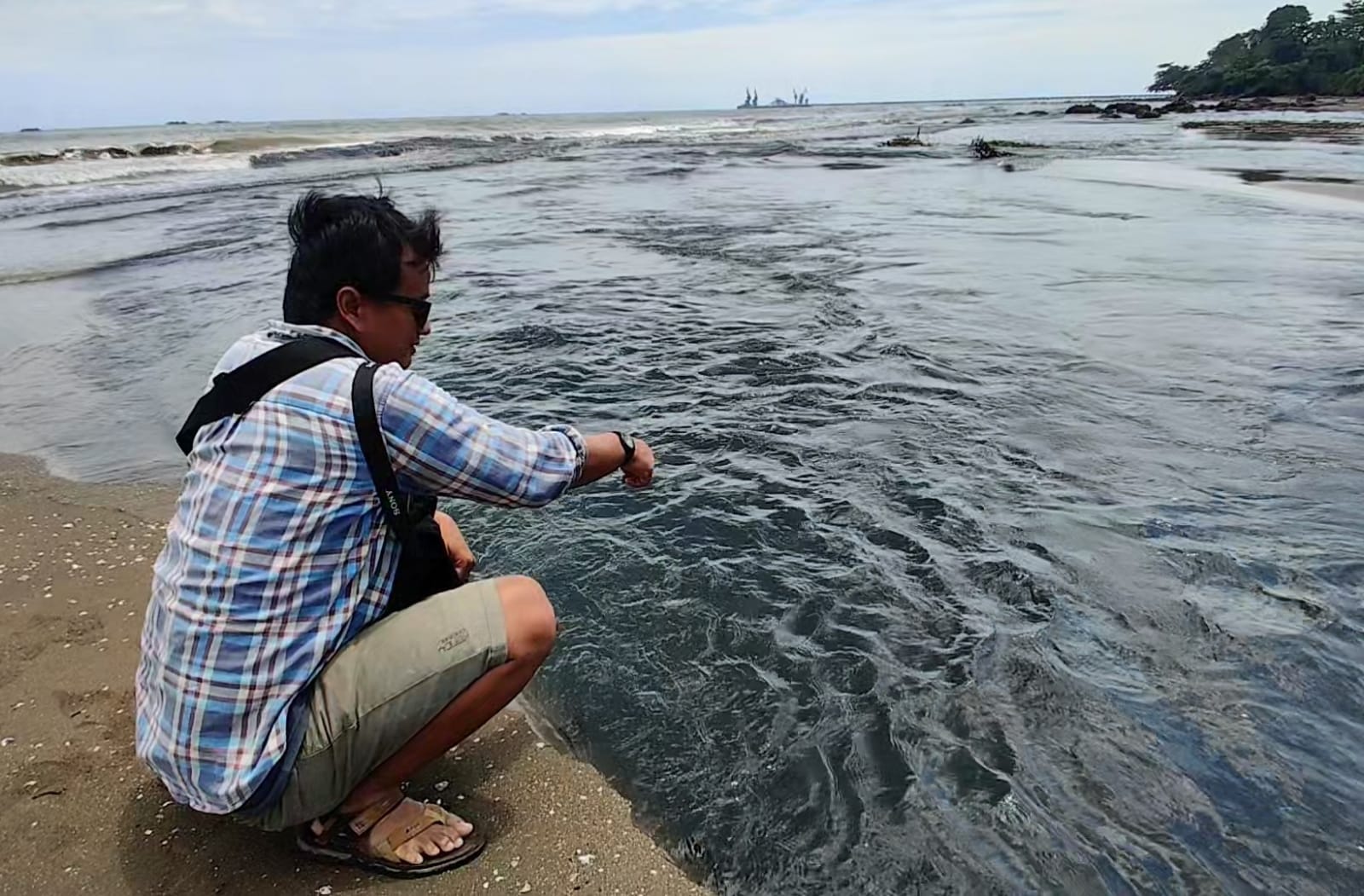 Sarto menyebut air laut yang berubah warna menjadi hitam itu sudah sejauh satu mil dari pesisir pantai dan terus meluas hingga ke arah timur karena tersapu ombak.