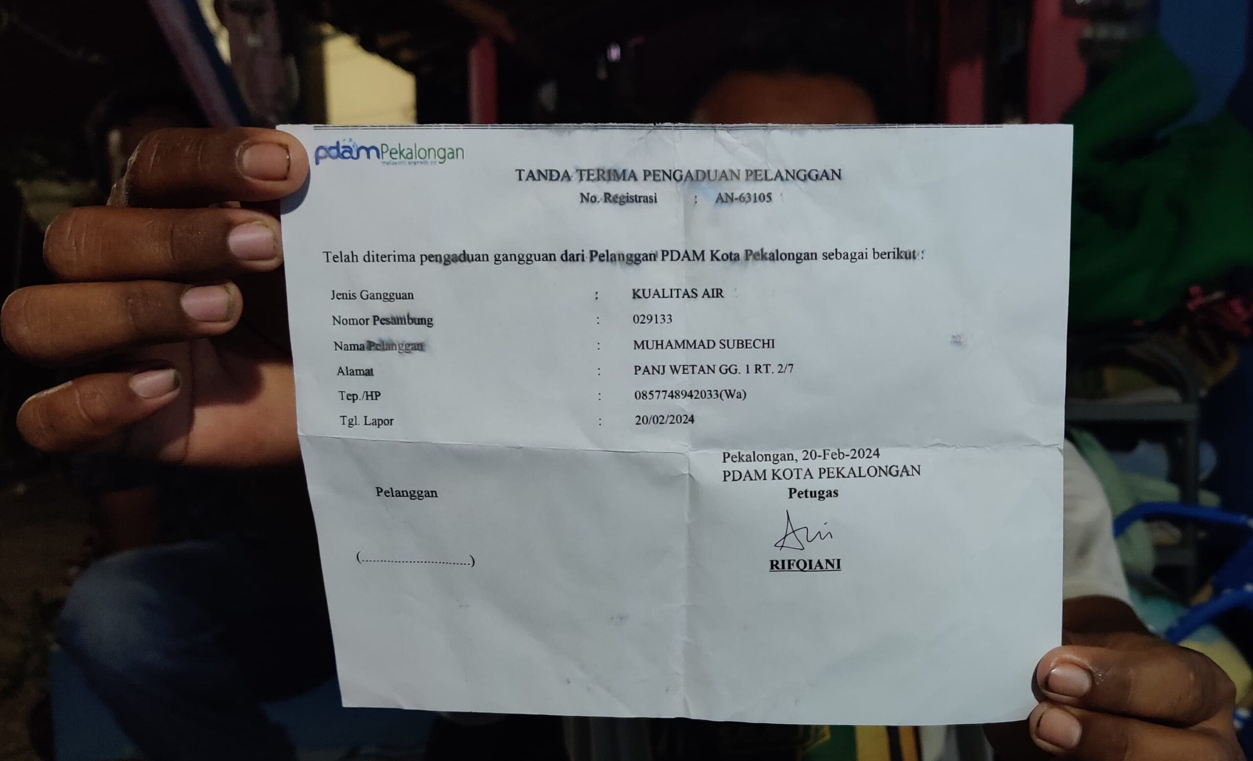 Warga Kampung Kebonan menunjukkan surat pengaduan terkait air PDAM yang keruh dan belum ditindaklanjuti selama berbulan-bulan, Selasa (16/4).