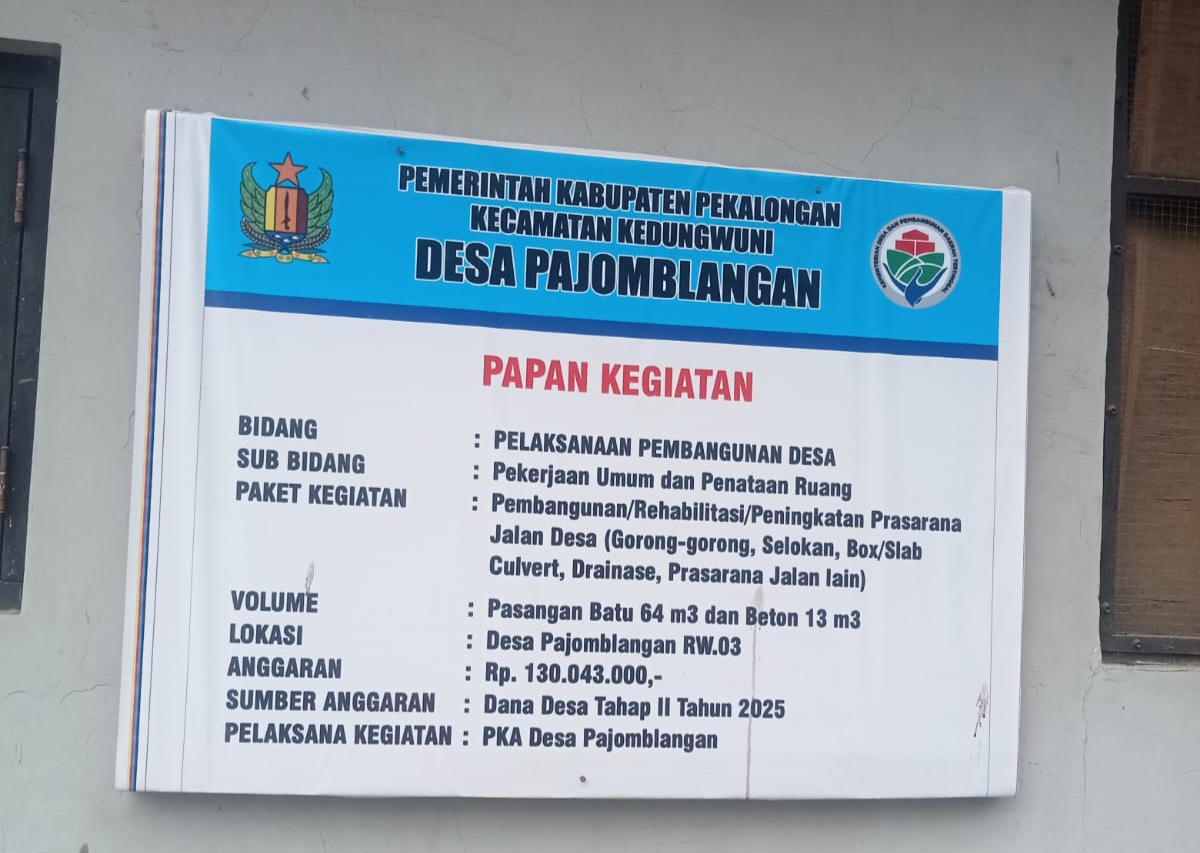 Proyek tersebut tercantum dalam papan kegiatan resmi dengan nama “Pembangunan/Rehabilitasi/Peningkatan Prasarana Jalan Desa (Gorong-gorong, Selokan, Box/Slab Culvert, Drainase, Prasarana Jalan Lain)”, berlokasi di RW 03 Desa Pajomblangan. Kegiatan menggunakan Dana Desa Tahap II Tahun 2025 senilai Rp130,04 juta, dengan Pelaksana Kegiatan Anggaran (PKA) dari pihak desa.Minggu (26/10/25).